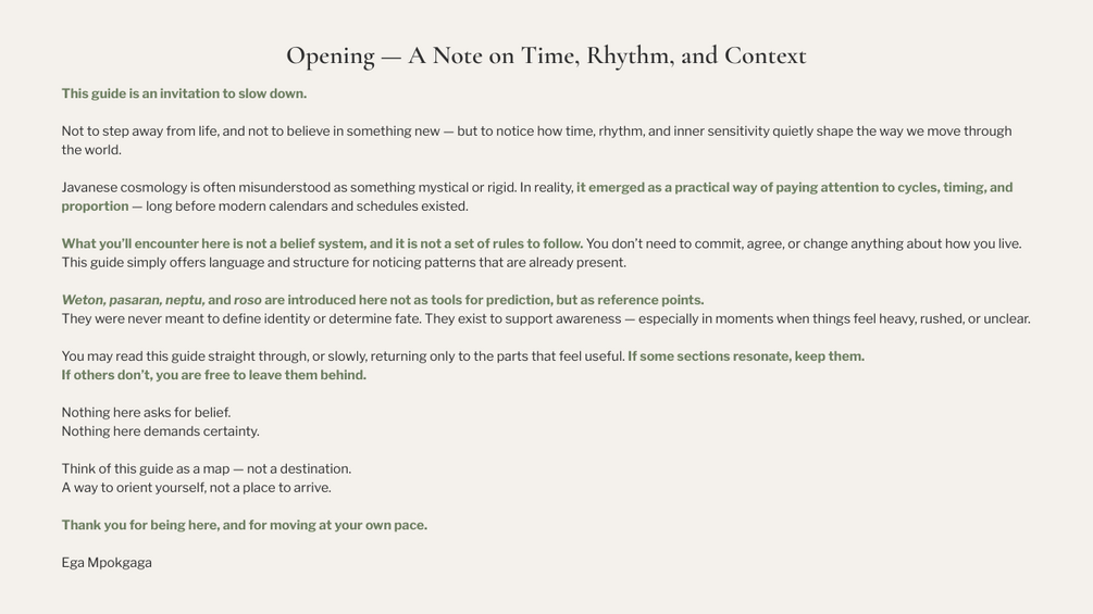 You’ll receive a thoughtfully designed digital guide (PDF) exploring weton as a framework for awareness, rhythm, and personal reflection, including guided reflection pages you can return to over time.